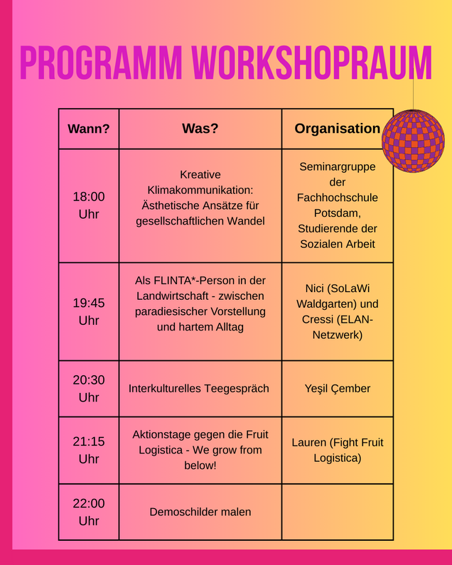 Unter dem Demo-Motto „Haltung zeigen! Für eine zukunftsfähige Landwirtschaft weltweit“ geht es in Workshops und Inputs um Agrarwende, Ernährung und Landwirtschaft. 2026 ist das Internationale Jahr der Bäuer*innen, und wir rücken queerfeministische, antirassistische und migrantische Perspektiven in den Mittelpunkt. So machen wir sichtbar, wie eng Landwirtschaft mit globaler Gerechtigkeit verbunden ist.
