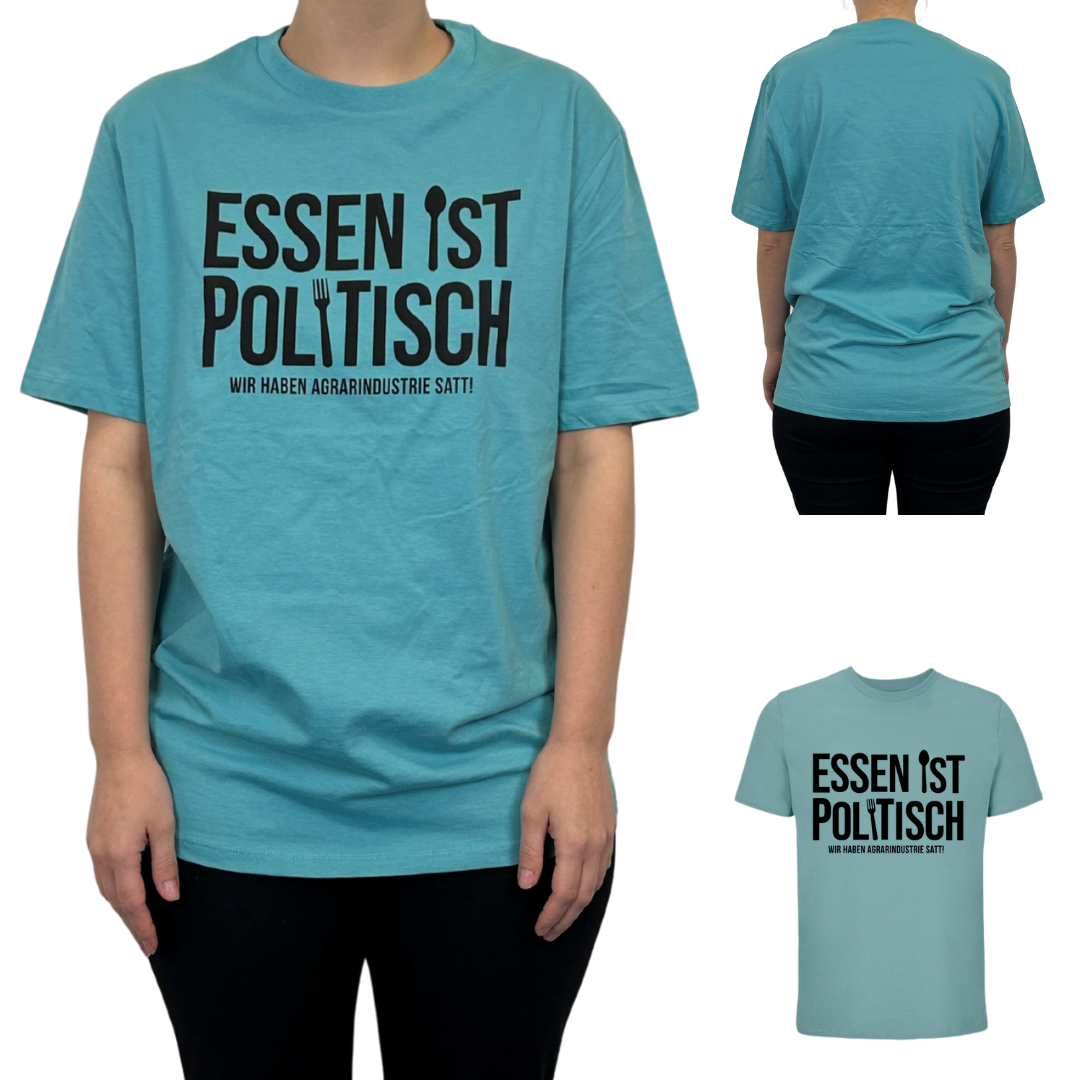 Das T-Shirt in der Farbe "pool blue" mit dem Aufdruck "Essen ist politisch!"