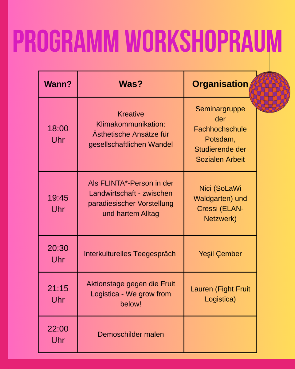 Unter dem Demo-Motto „Haltung zeigen! Für eine zukunftsfähige Landwirtschaft weltweit“ geht es in Workshops und Inputs um Agrarwende, Ernährung und Landwirtschaft. 2026 ist das Internationale Jahr der Bäuer*innen, und wir rücken queerfeministische, antirassistische und migrantische Perspektiven in den Mittelpunkt. So machen wir sichtbar, wie eng Landwirtschaft mit globaler Gerechtigkeit verbunden ist.