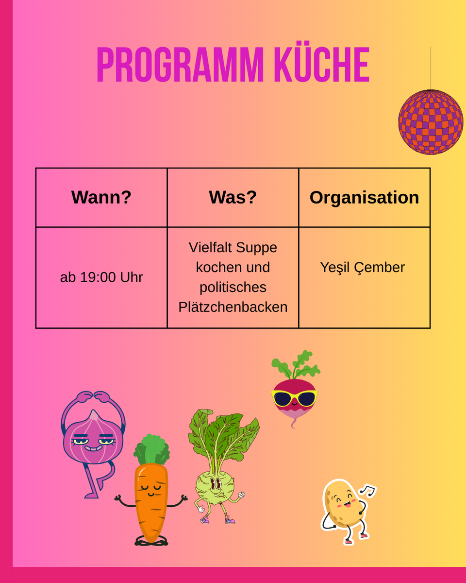 Die Schnippeldisco verbindet politisches Engagement, Gemeinschaft und Musik. Wir schnippeln gespendetes Gemüse, kochen eine große Suppe und essen zusammen. Am nächsten Tag wird die Suppe bei der „Wir haben es satt!“-Demonstration verteilt. Begleitet wird der Abend von DJ-Sets. Bringt alle mit und gestaltet mit uns gemeinsam einen schönen und solidarischen Abend.