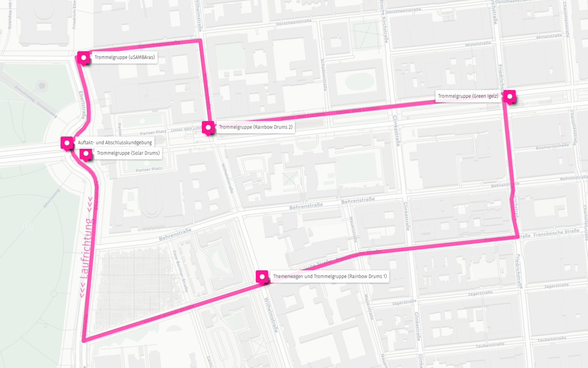 Angemeldete Demoblöcke mit ihren Treffpunkten am Kundgebungsort in der geplanten Reihenfolge im Demozug (von vorne nach hinten):
